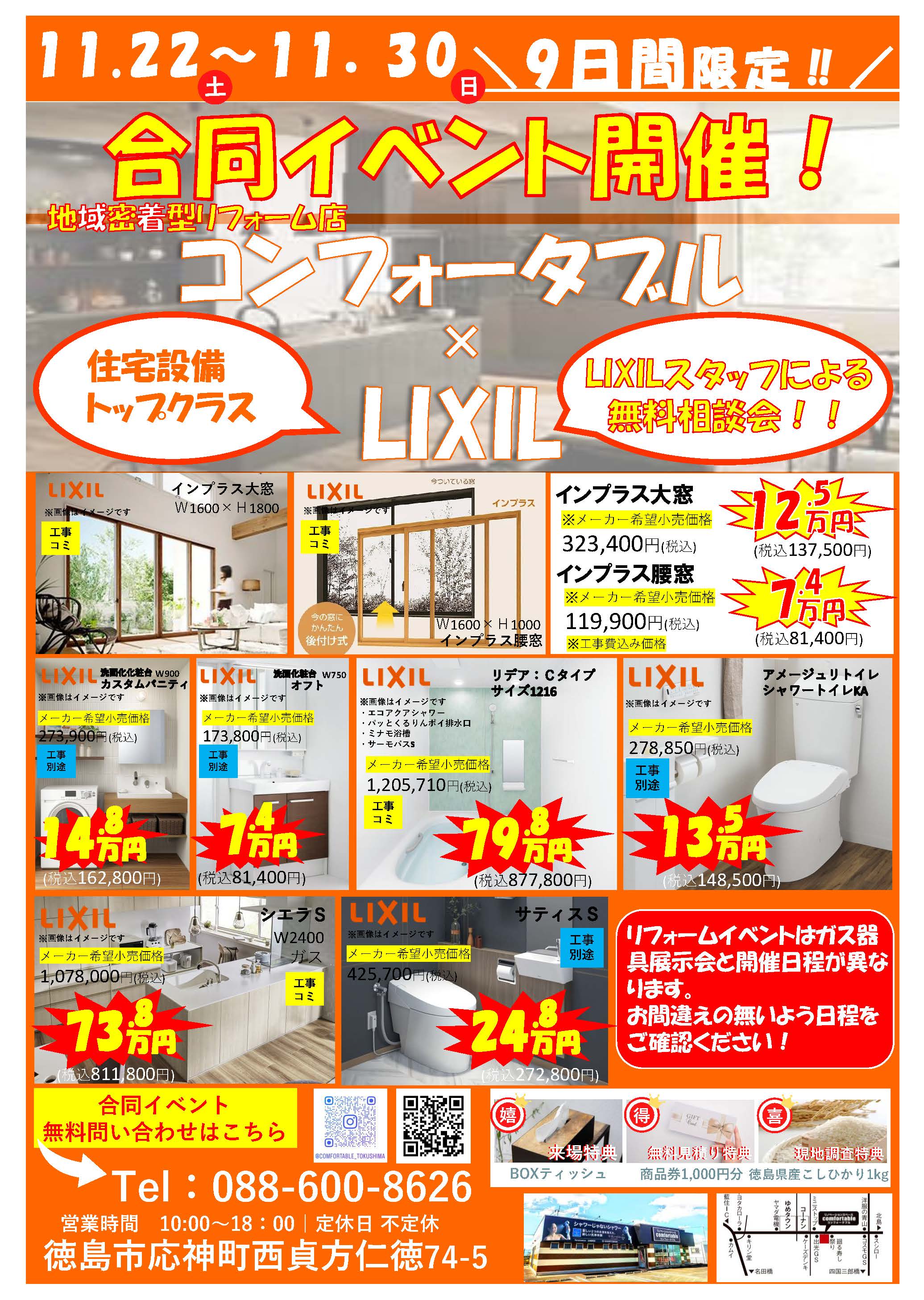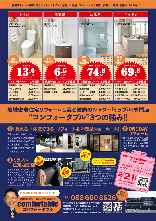 リノベーションスペースコンフォータブルでは、お客様自身が商品を「見れる。」「体感できる。」事を大事にし、大型ショールームを構えていますので、ぜひ一度お越しください。